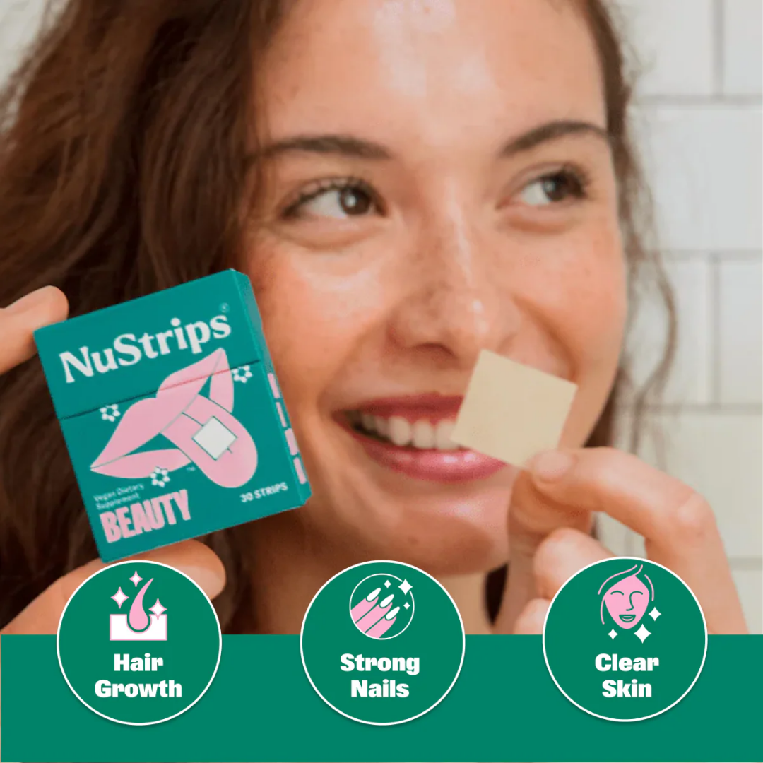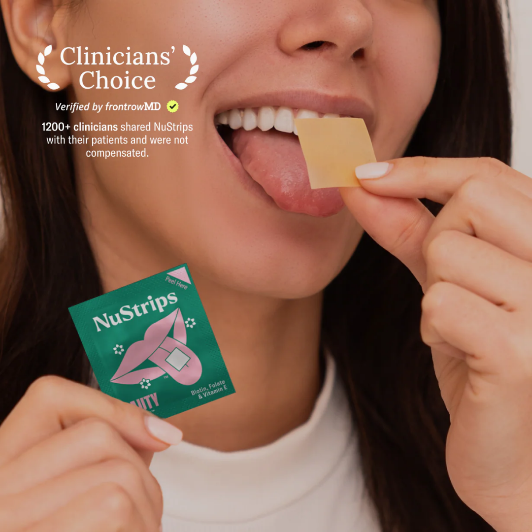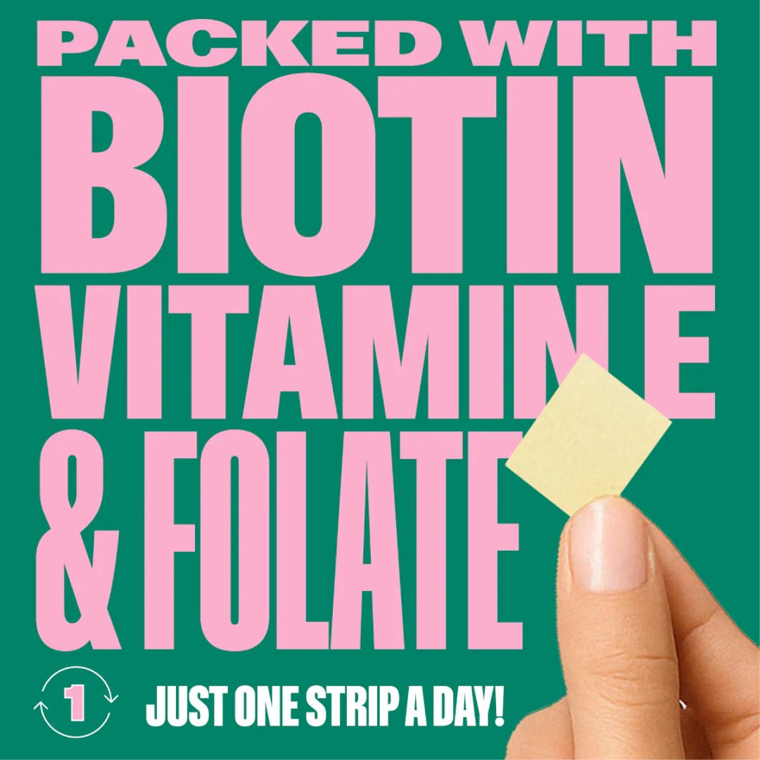 Beauty science, revolutionized. Our patented strip technology delivers a concentrated dose of Biotin, Folate, and Vitamin E directly to your body, bypassing digestive barriers that trap nutrients in traditional supplements. It's beauty nutrition that actually reaches your hair, skin, and nails.