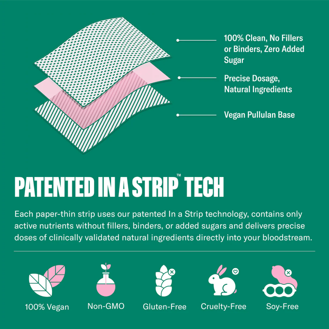 Each paper-thin strip uses our patented In a Strip technology, contains only active nutrients without fillers, binders, or added sugars and delivers precise doses of clinically validated natural ingredients directly to your body.†