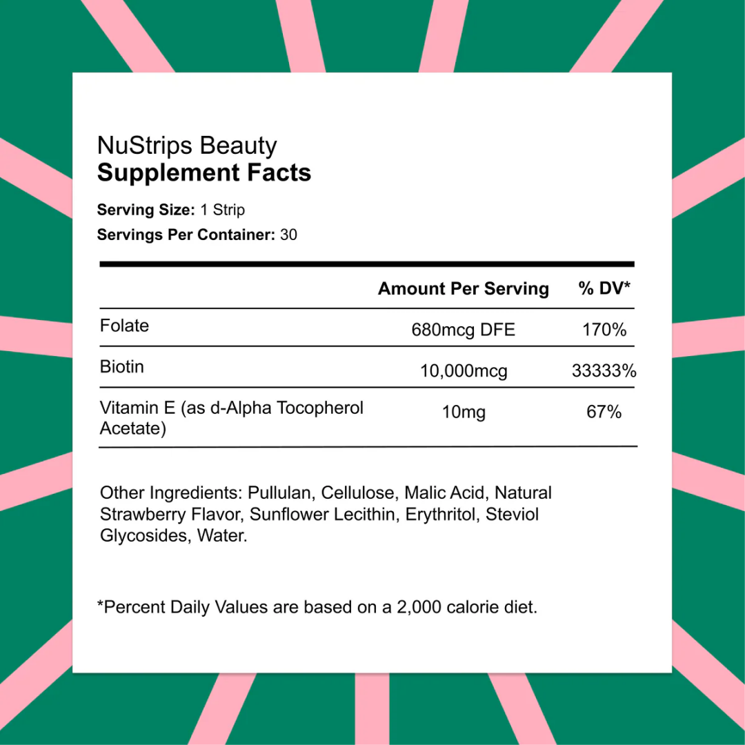 - 👅 BEAUTY THAT MELTS ON YOUR TONGUE: Each tiny strip is packed with a certified combination of Biotin, Folate & Vitamin E. Just 1 strip a day gives you all the nutrition you need for: ✅ Healthy hair ✅ Strong nails ✅ Clear skin.